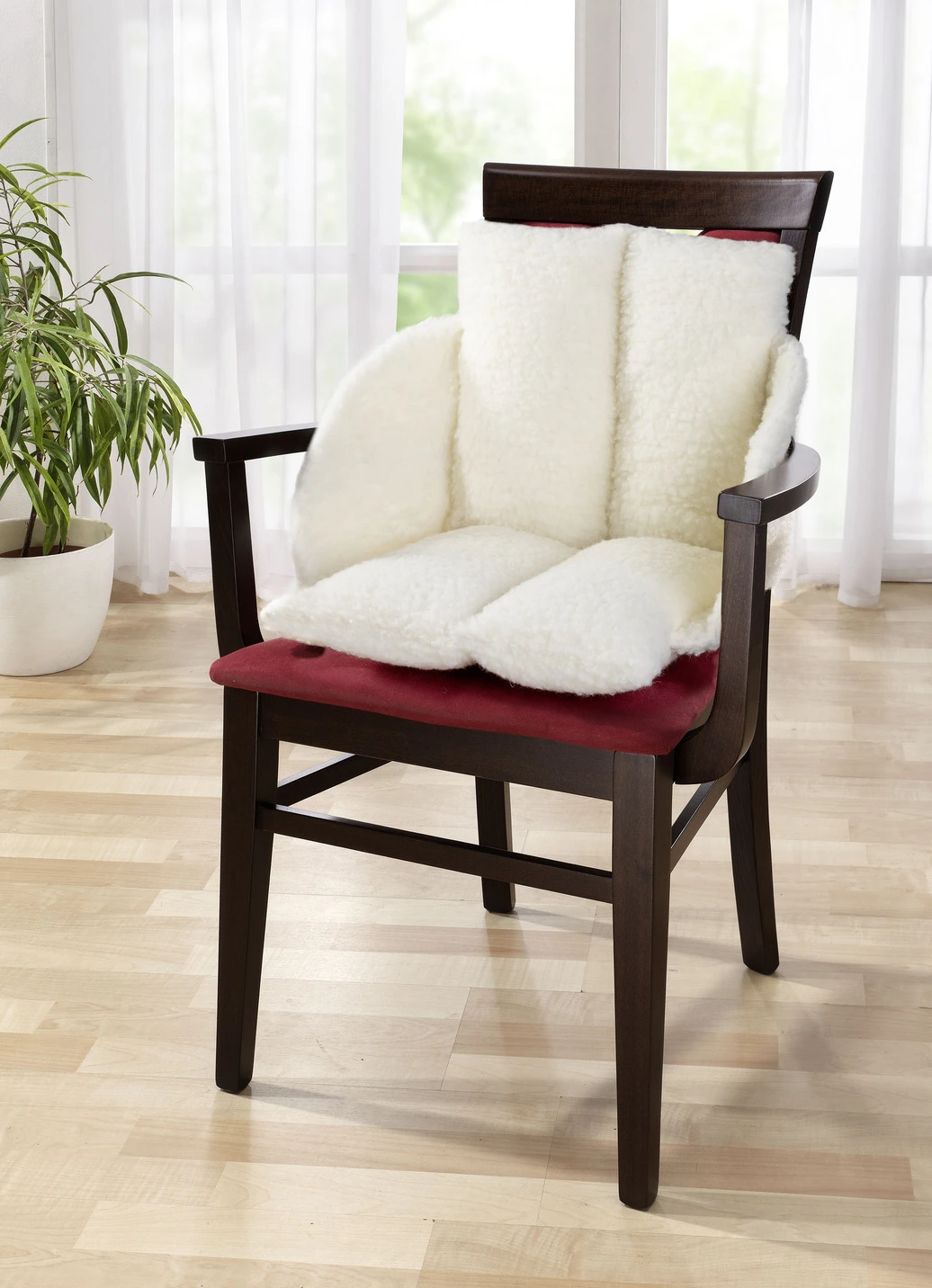 Bequeme Licardo-Wohnaccessoires aus 100% Schafschurwolle im Flor. Reine Schurwolle fühlt sich wunderbar weich an, ist angenehm wärmend, atmungsaktiv sowie temperatur- und feuchtigkeitsausgleichend. Handwäsche bis 30 °C. Mit Samtbandeinfassung. Stuhl- und Rückenkissen je mit 2,5 cm starker Schaumstoffpolsterung