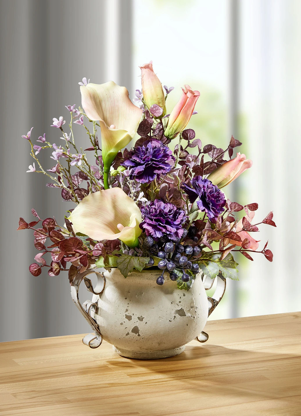 Ein Traum von einem Gesteck ist dieses üppig gestaltete Calla-Gesteck mit lilafarbenen Nelken, Blüten und Blattwerk sowie grünem Beiwerk. Eingesetzt in einen aus Metall gefertigten Valo-Topf mit Henkeln. Aus Kunst- und Textilmaterial gefertigt. Maße: Topf ø 12,5 cm, Höhe 12 cm; Gesamthöhe ca. 32 cm