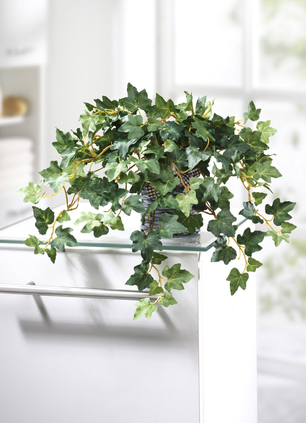 Efeu aus täuschend echt wirkendem Kunst- und Textilmaterial, eingesetzt in einen Glastopf mit Übertopf aus Rattan sowie mit braun-weiß karierter Schleife dekoriert.