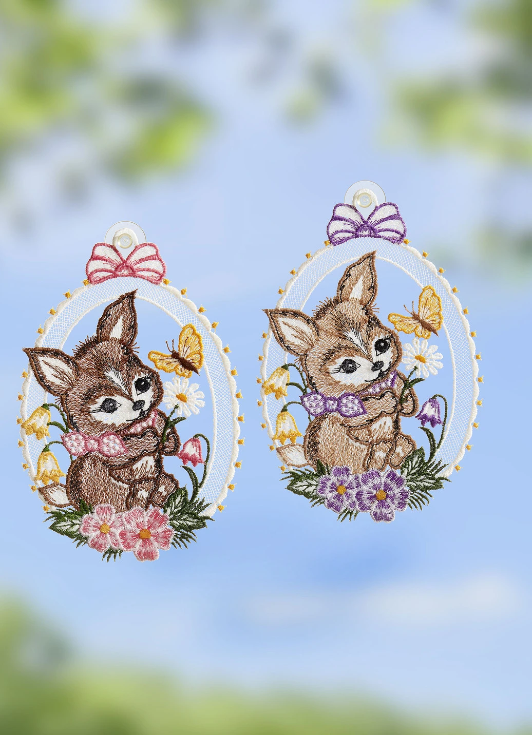 Frühlingshaften Charme in Ihrem Zuhause versprüht dieses entzückende 2er-Set Fensterbilder aus echter Plauener Spitze, das ein süßes Häschen beim Spielen auf Blumen zeigt. Mit Saughaken zur einfachen Befestigung. Die Qualität: 100% Polyester. Maße je: H19xB13 cm