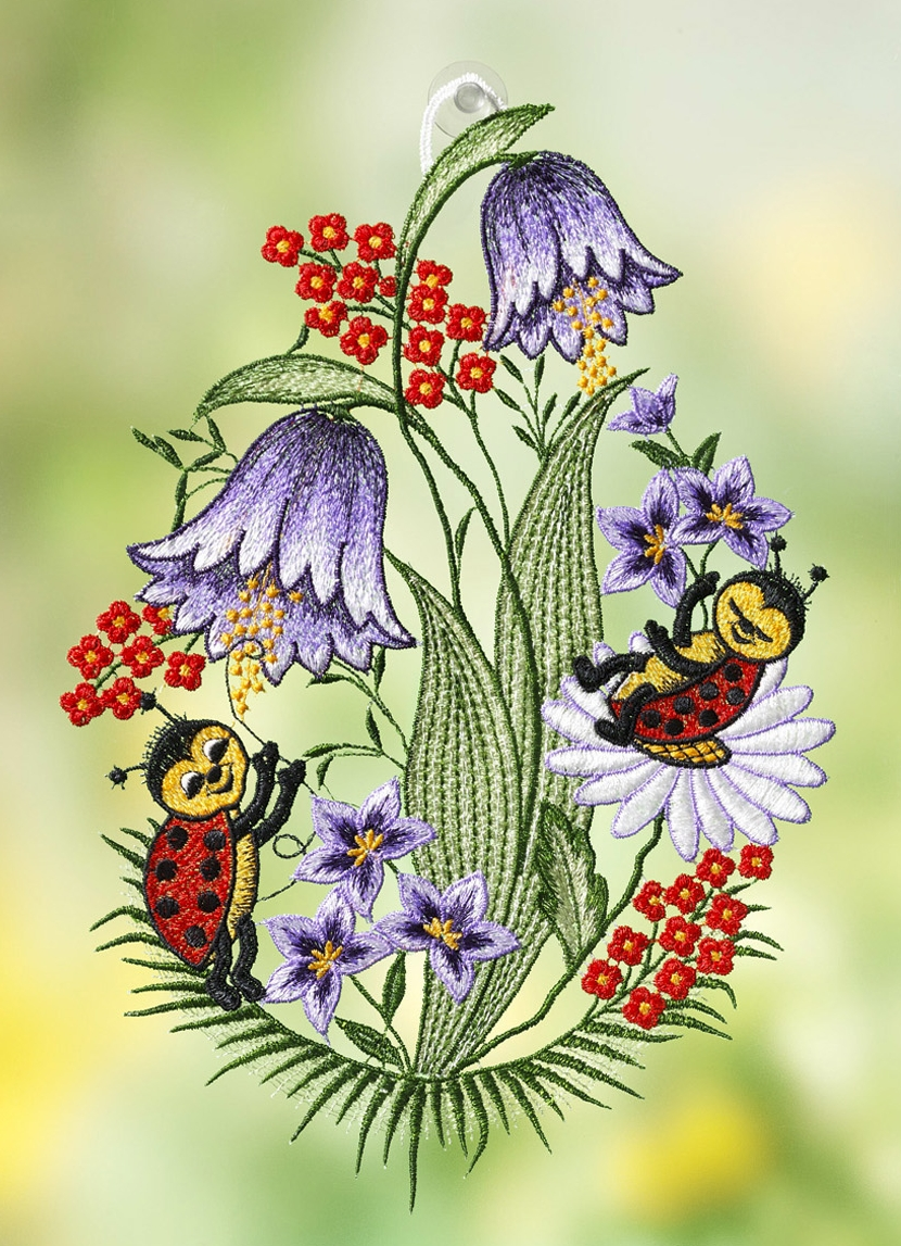 Einfach goldig sind die beiden Marienkäfer auf diesem Fensterbild aus echter Plauener Spitze, die in den Blumen sitzen und von einem sonnigen Frühlingstag träumen.
