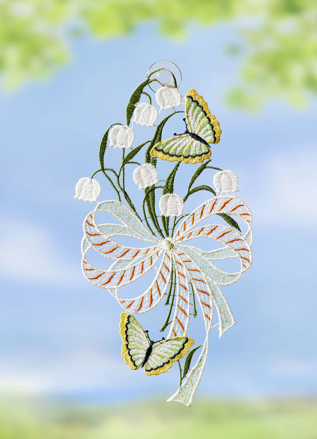 Absolut hinreißendes, in Deutschland gefertigtes Fensterbild aus echter Plauener Spitze. Es zeigt ein bezauberndes Maiglöckchen mit Schmetterlingen. Mit Saughaken zur einfachen Befestigung. Qualität: 100% Polyester.