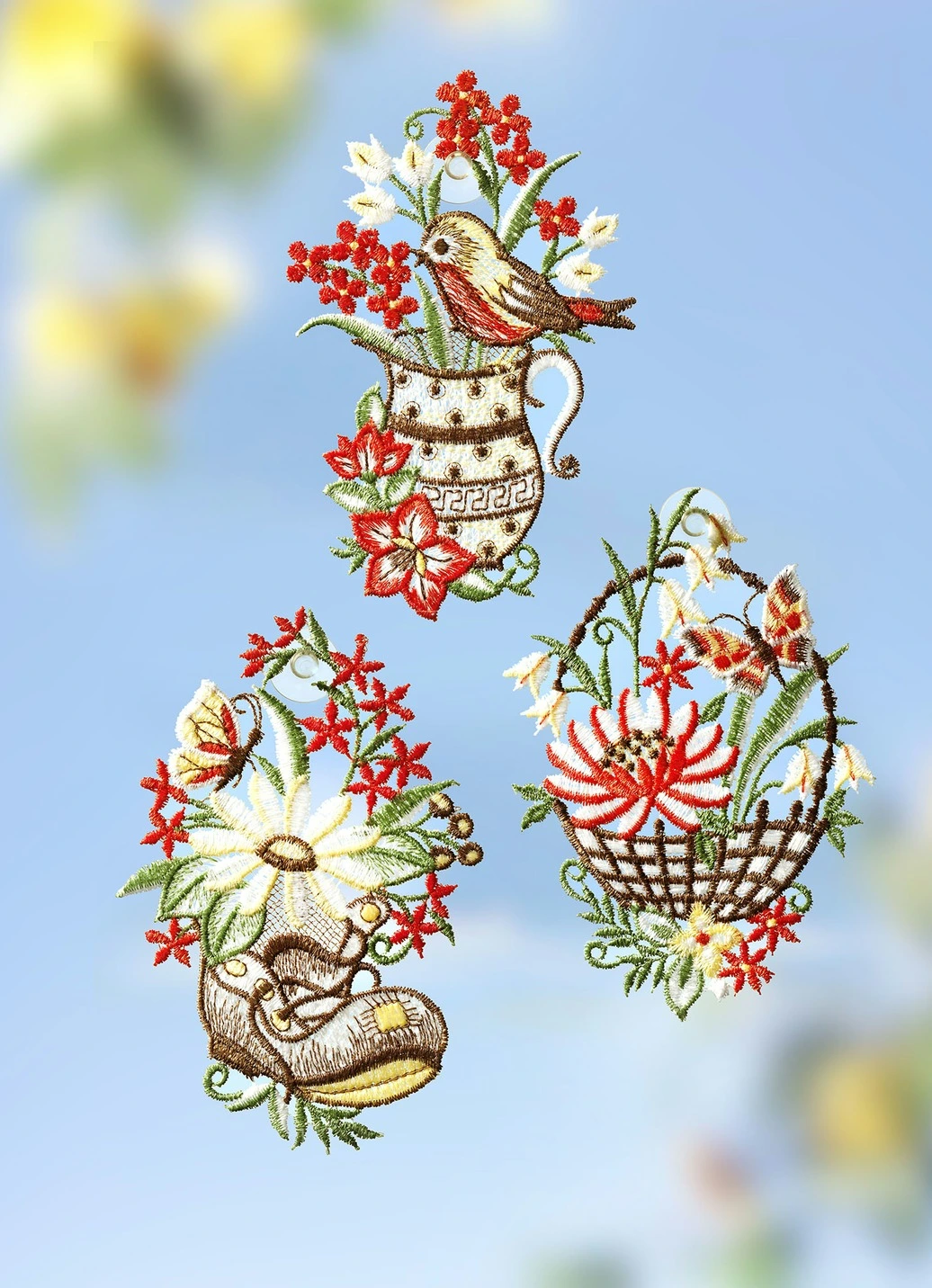 Das herrliche Fensterbilder, 3er-Set aus echter Plauener Spitze ist ein wunderbarer Begleiter durch die gesamte Frühlingszeit und sorgt für einen wunderschönen Ausblick in die erwachende Natur. Mit praktischen Saughaken zur einfachen Befestigung. Qualität: 100% Polyester.