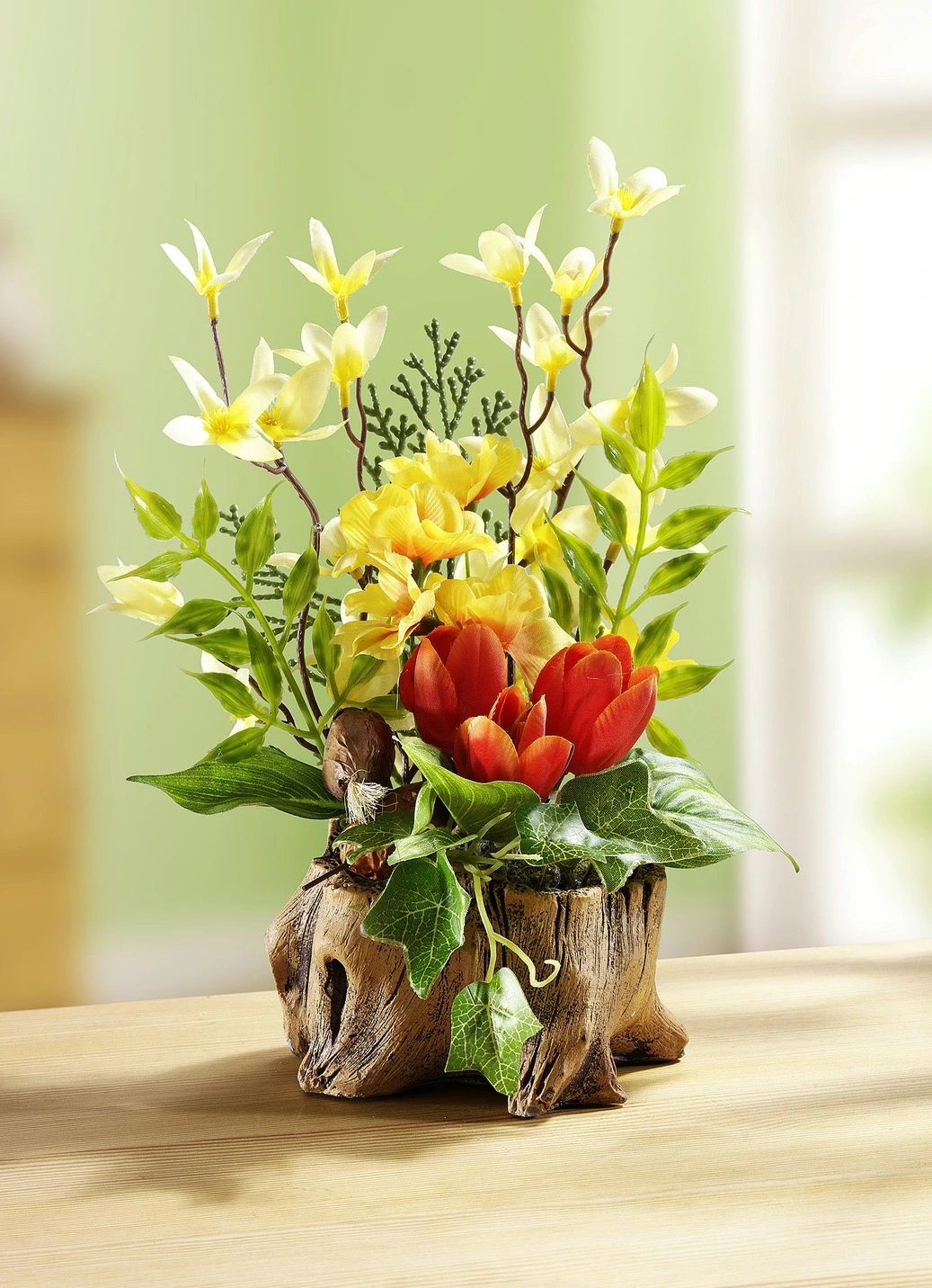 Dieses schöne Gesteck aus Tulpen, Forsythien und grünem Beiwerk ist fest in einen originellen Keramiktopf in Form eines Holzstammes eingesetzt.