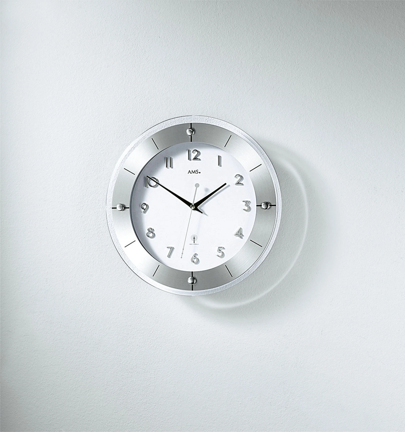 Hochwertige, runde Wanduhr von AMS, aus facettiertem Mineralglas und geschliffenem Aluminium. Zifferblatt mit aufgelegten, arabischen Ziffern und schwarzen Metallzeigern.