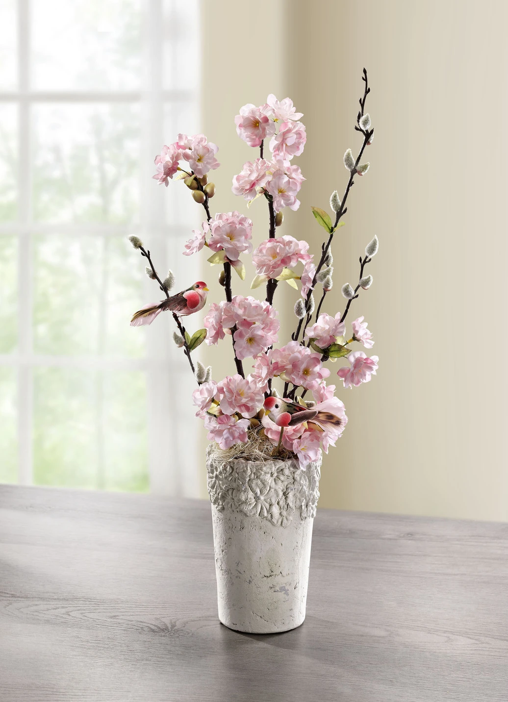 Die täuschend echt wirkenden Kirschblütenzweige sind mit Knospen und grünen Blättern geschmückt. Sie sind fest in einen verzierten Tontopf eingesetzt und bringen ein zauberhaftes Flair in Ihr Zuhause. Zwei niedliche Vögelchen aus Styropor runden das Gesamtbild perfekt ab. Liebevoll aus Kunst- und Textilmaterial gefertigt.