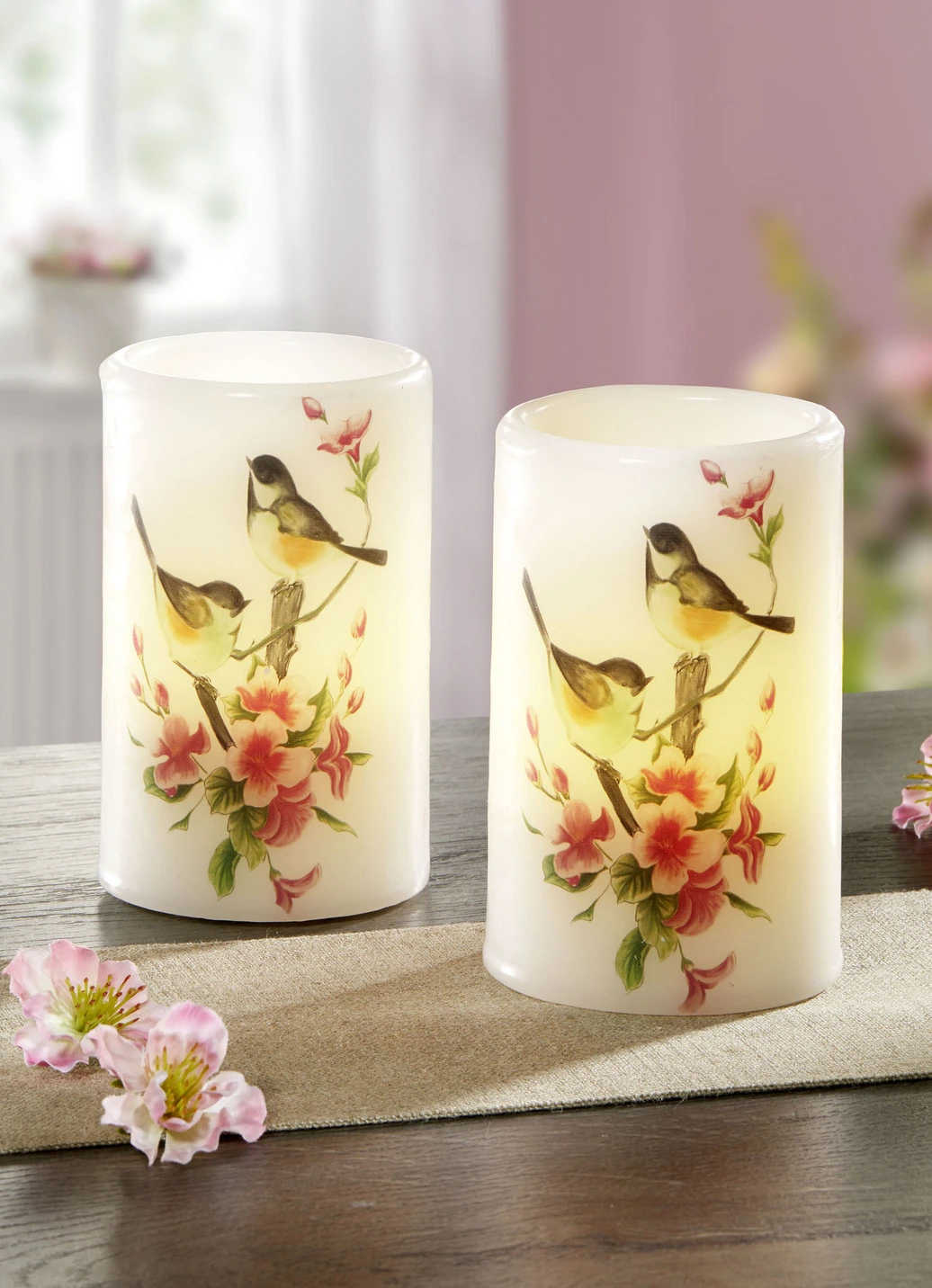 Diese LED-Echtwachskerzen sorgen für frühlingshafte Stimmung in Ihrem Zuhause. Zu sehen sind 2 Vögelchen, die es sich auf einem blühenden Zweig gemütlich gemacht haben.