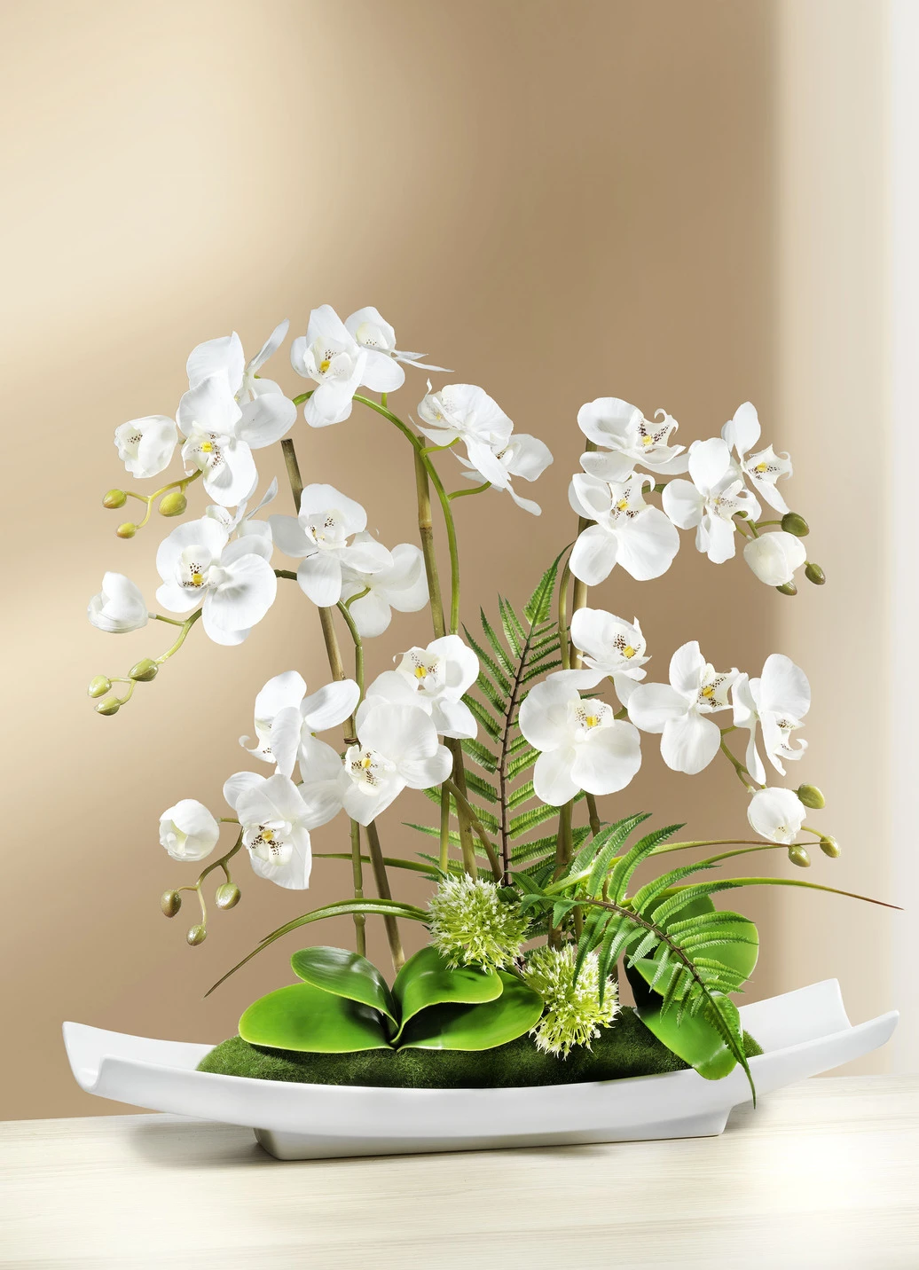 Eine schöne Dekoration für Ihr Zuhause ist diese tolle Orchidee mit zahlreichen Blüten. Sie wurde fest in eine schiffsförmige Schale aus Keramik eingesetzt. Aus hochwertigem Kunst- und Textilmaterial.