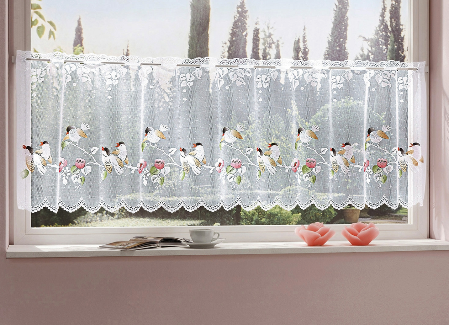 Romantische Fenster- und Türdekoration mit Stangendurchzug in Größe 860 (Kurzstore, H 50xB 90 cm) und in Weiss-Bunt.