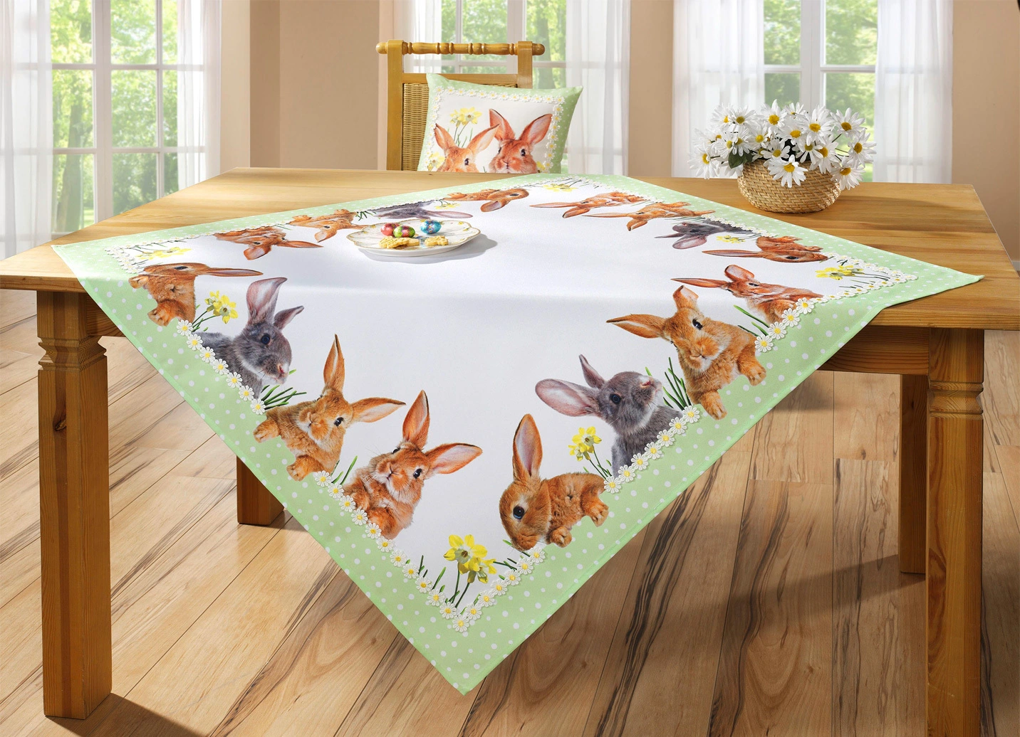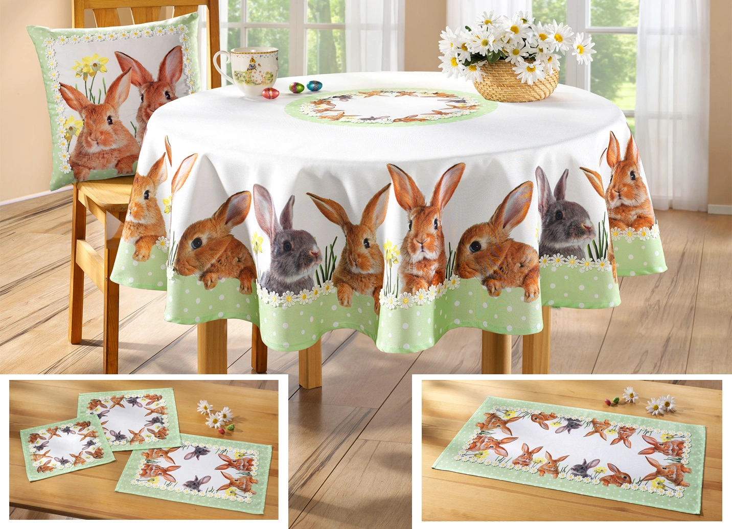Tisch- und Raumdekoration mit Hasen-Motiven in Größe 404 (Kissenbezug, 40x 40 cm) und in Weiss-Bunt.
