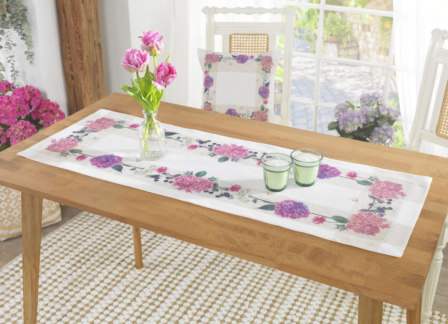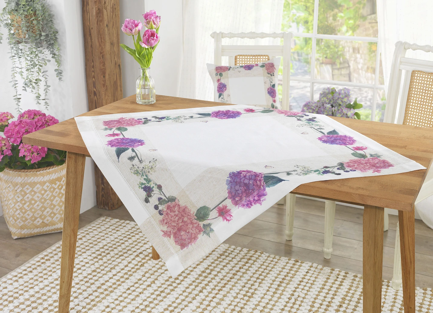 Tisch- und Raumdekoration mit Hortensien-Motiv in Größe 101 (Deckchen, ca. 35x 50 cm) und in Sekt-Bunt.
