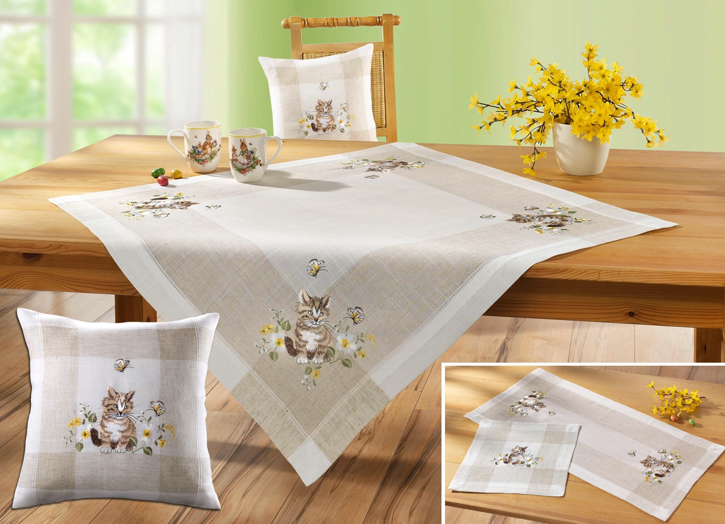 Diese entzückenden Accessoires werden Sie begeistern! Ein bezauberndes Kätzchen, Blüten und Schmetterlinge sind auf dieser wundervollen Tisch und Raumdekoration dargestellt. Kissenbezug mit Reißverschluss.