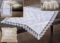 Tisch- und Raumdekoration mit Macramé-Spitzenbordüre in Größe 101 (Läufer, 40x 90 cm) und in Weiss.