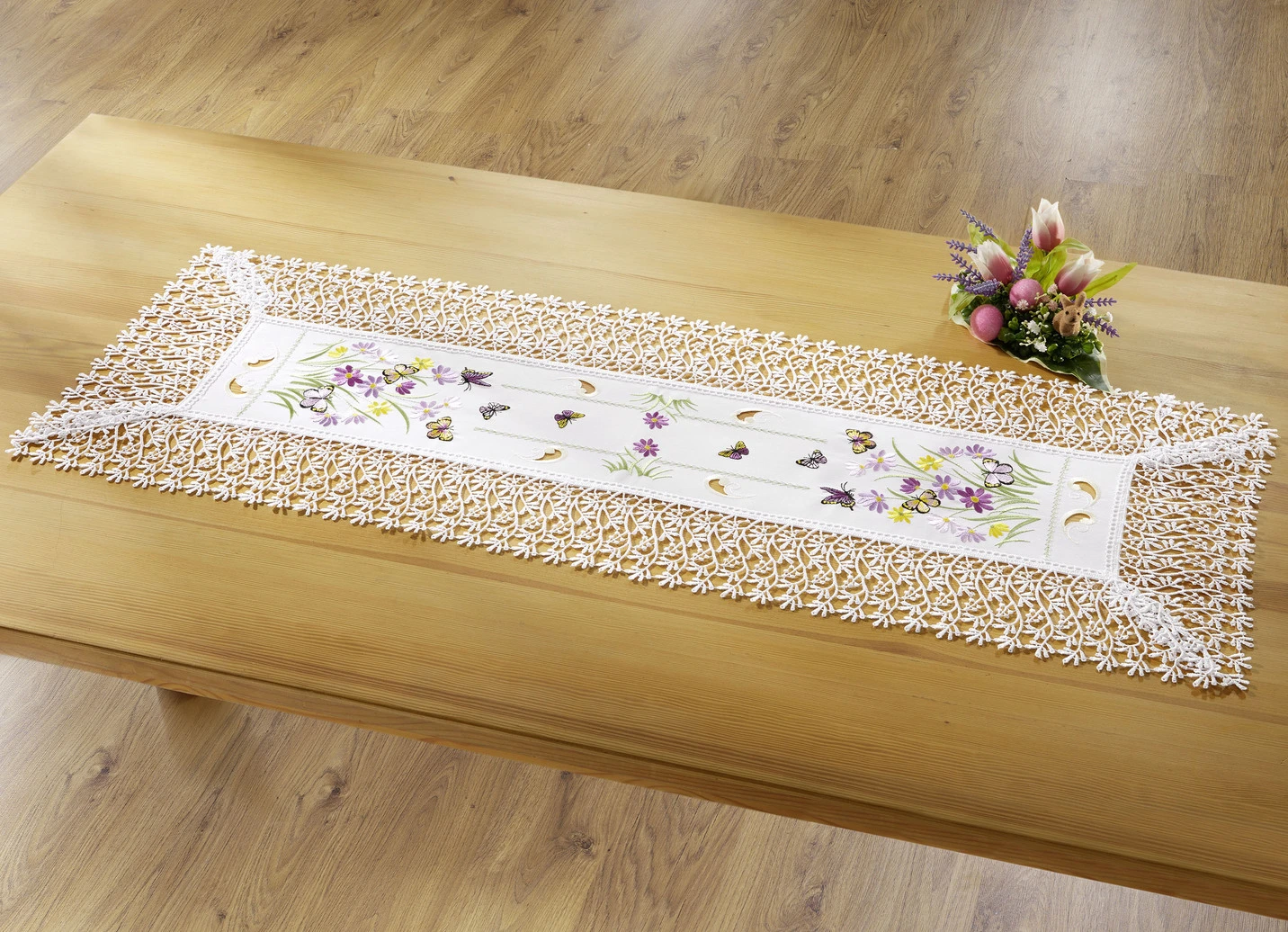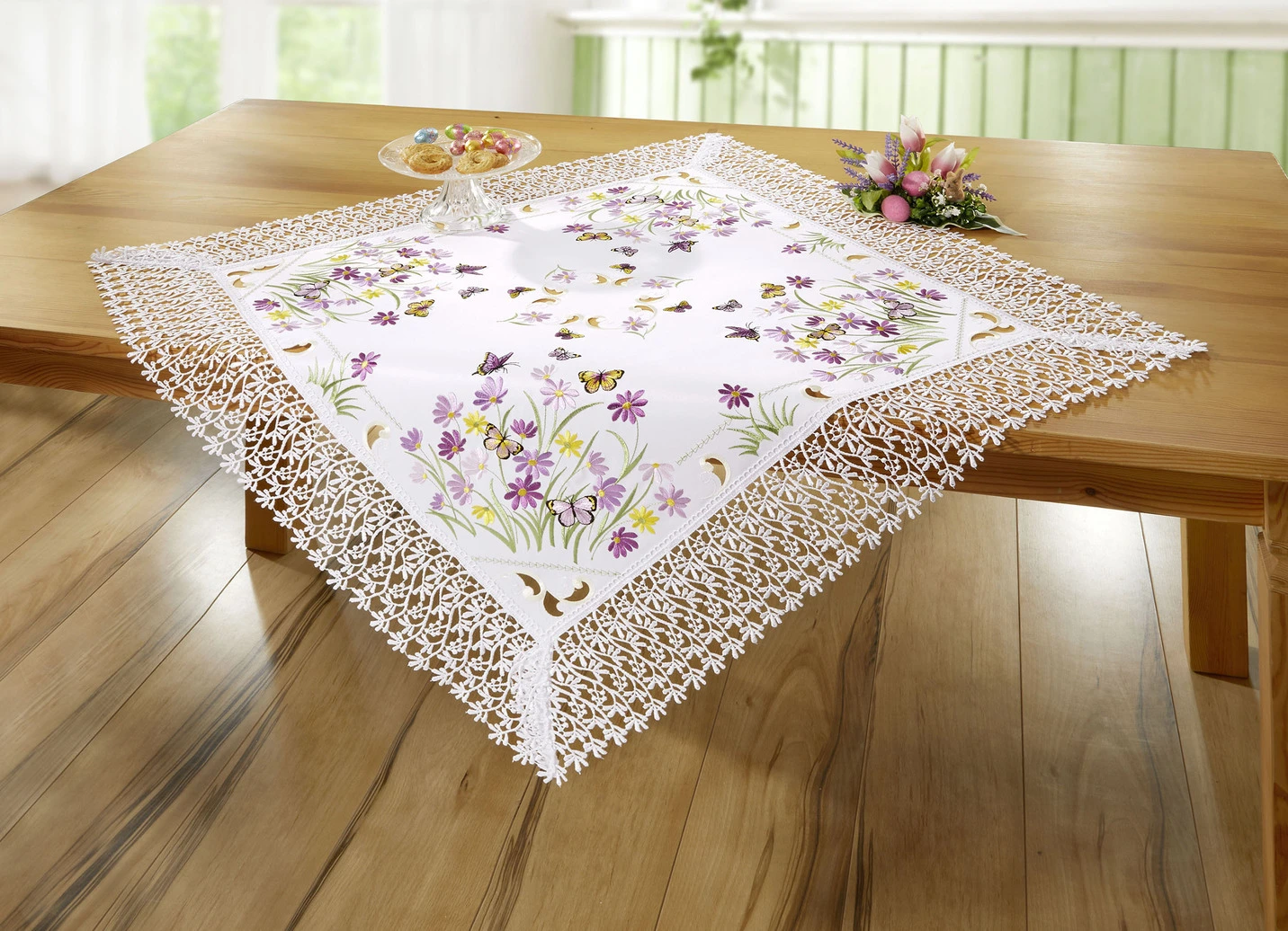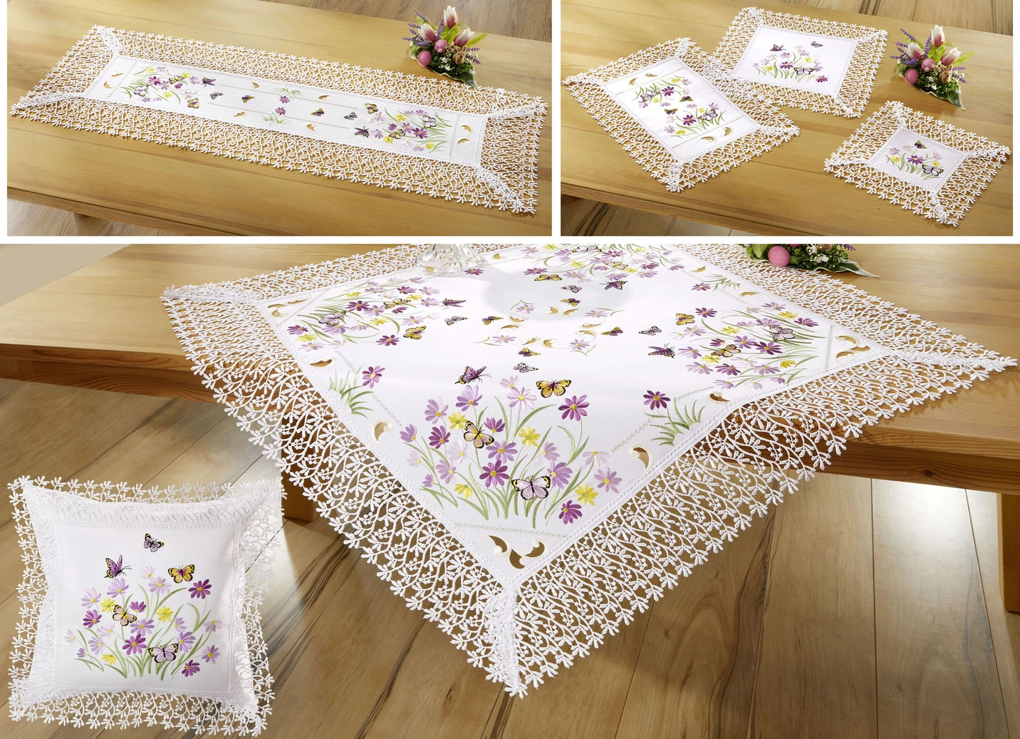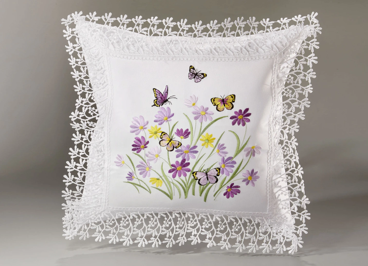 Setzen Sie mit dieser hübsch bestickten Tisch- und Raumdekoration frühlingshafte Blickpunkte in Ihrem Zuhause. Die vielen Blümchen und Schmetterlinge werden durch die hochwertige Spitzenborte besonders schön hervorgehoben. Kissenbezug mit praktischem Reißverschluss.