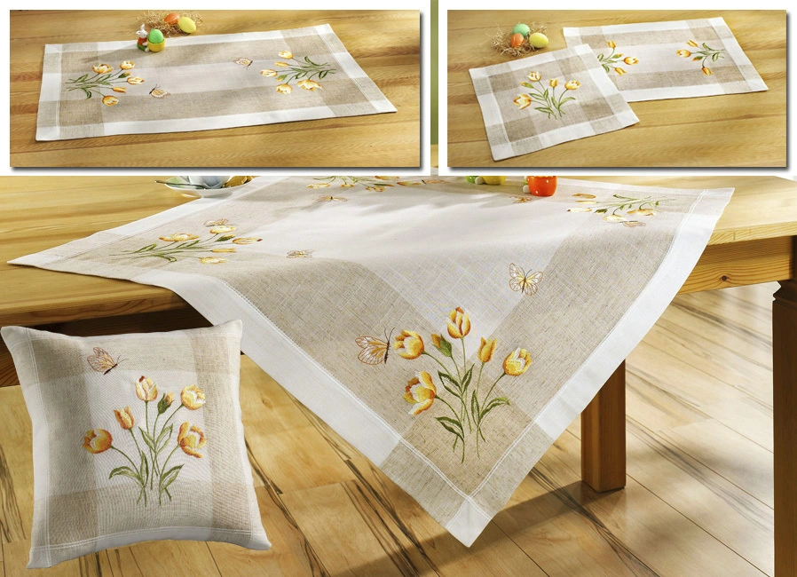 Frühlingsfrisches Flair verströmt diese zart anmutende Tisch- und Raumdekoration mit Tulpen und Schmetterlingen. Kissenbezug mit praktischem Reißverschluss.