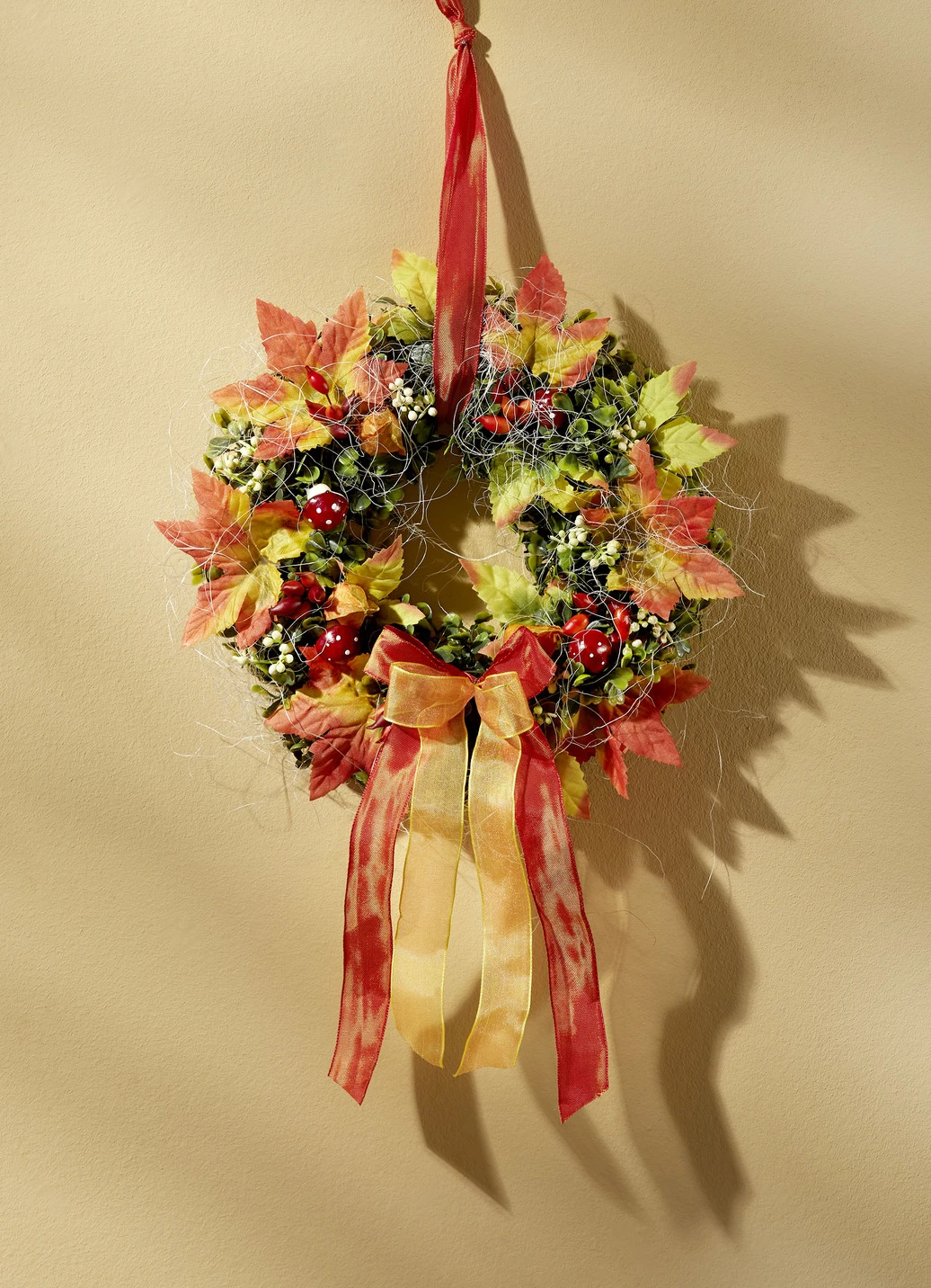 Perfekt für diese Jahreszeit ist dieser Wandkranz in herbstlichen Farben. Mit kleinen Pilzen, Ahornblättern und Beeren. Aus Kunst- und Textilmaterial gefertigt. Das passende Textilschleifenband rundet das Arrangement stimmig ab. Maße: ø 25 cm, Länge 50 cm
