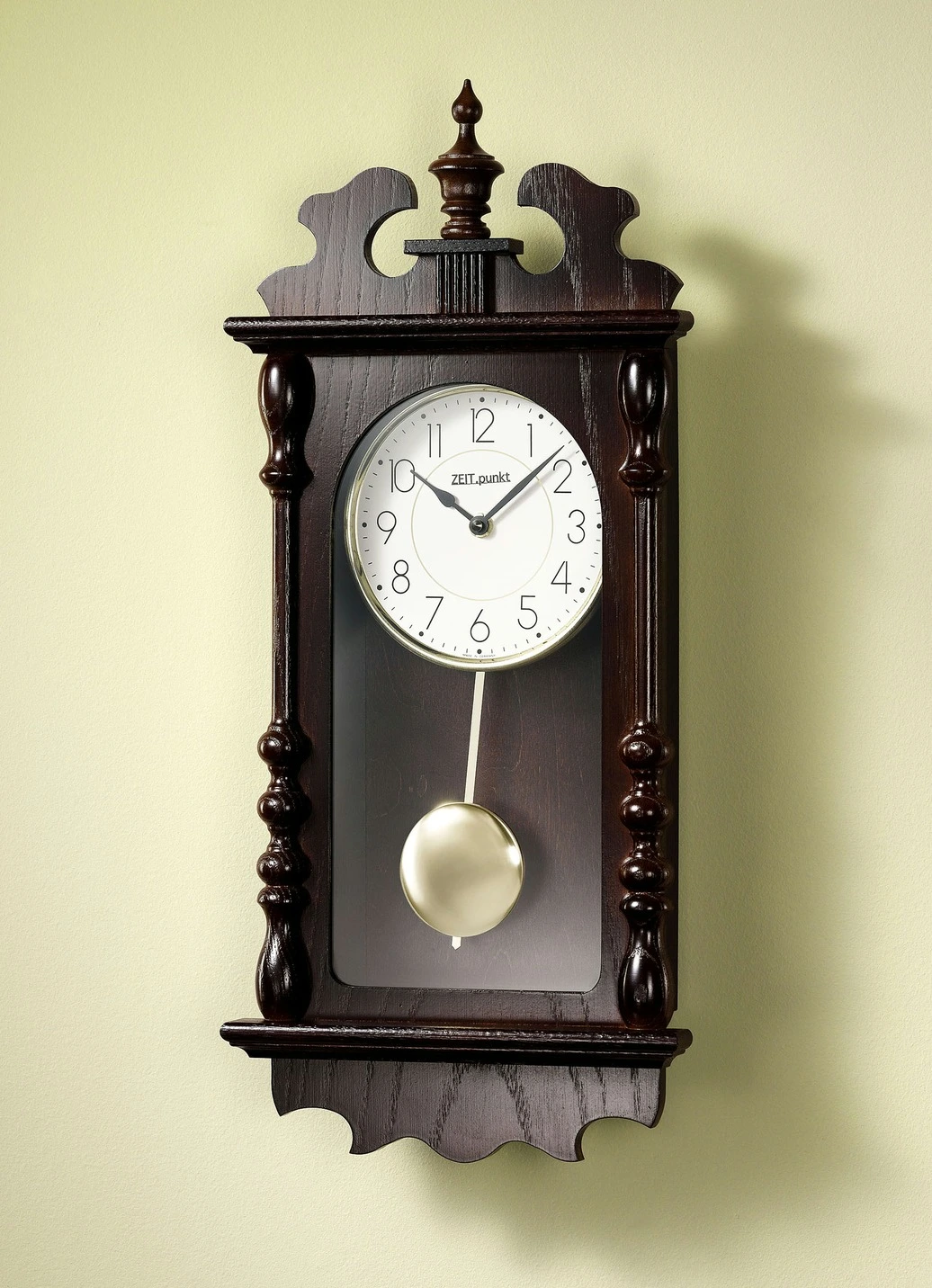 Klassische, in Deutschland hergestellte Wanduhr mit einem Gehäuse aus Massivholz. Das weisse Zifferblatt ist mit arabischen Ziffern und schwarzen Zeigern versehen. Mit goldfarbenem Metall-Pendel und Glasabdeckung. Das Quartz-Schlagwerk lässt sich vom Bimbam- zum Westminster-Schlag umschalten. Batteriebetrieben mit 2x 1,5 Volt Mignon (nicht im Lieferumfang enthalten).